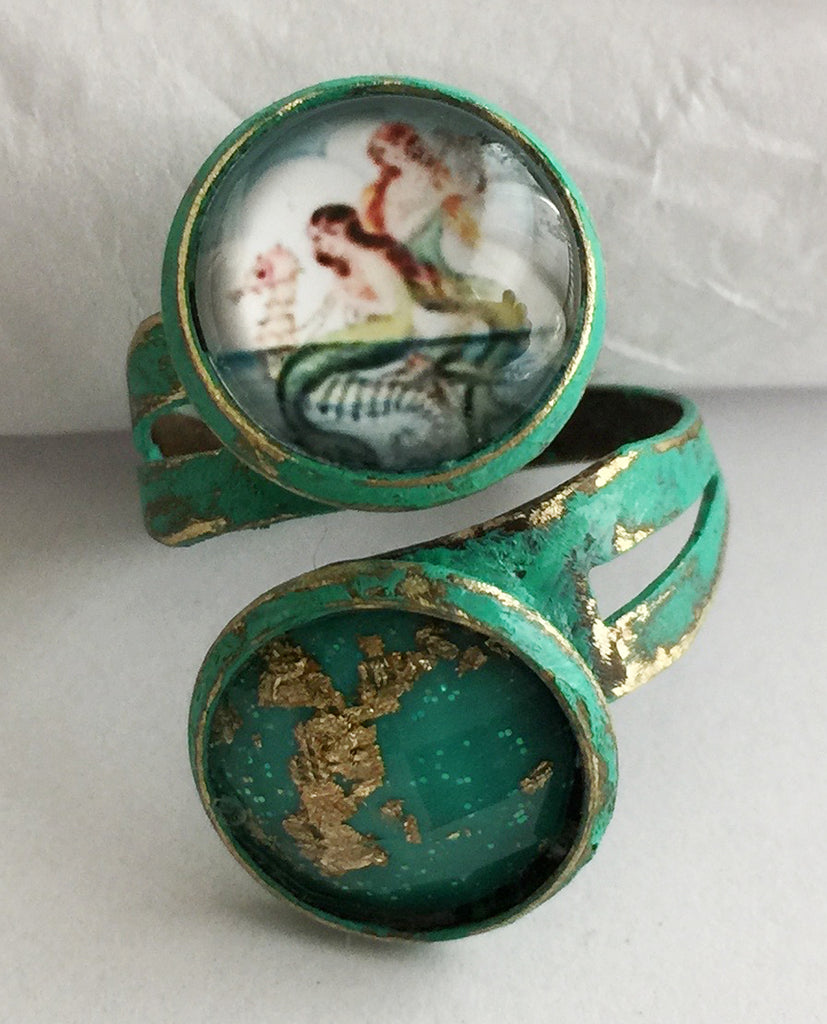 This is a fashion ring with a glass cabochon that has a vintage image of Mermaids and a faceted jadeite green and metallic gold flecked cab in a metal wrap setting with hand applied distressed verdigris colored enamel. The ring measures 1 1/8” at the front, is adjustable in size and is in new, unworn condition. Individually handcrafted in the USA. Please avoid exposure to water, such as swimming or showering while wearing. Pretty and unique!