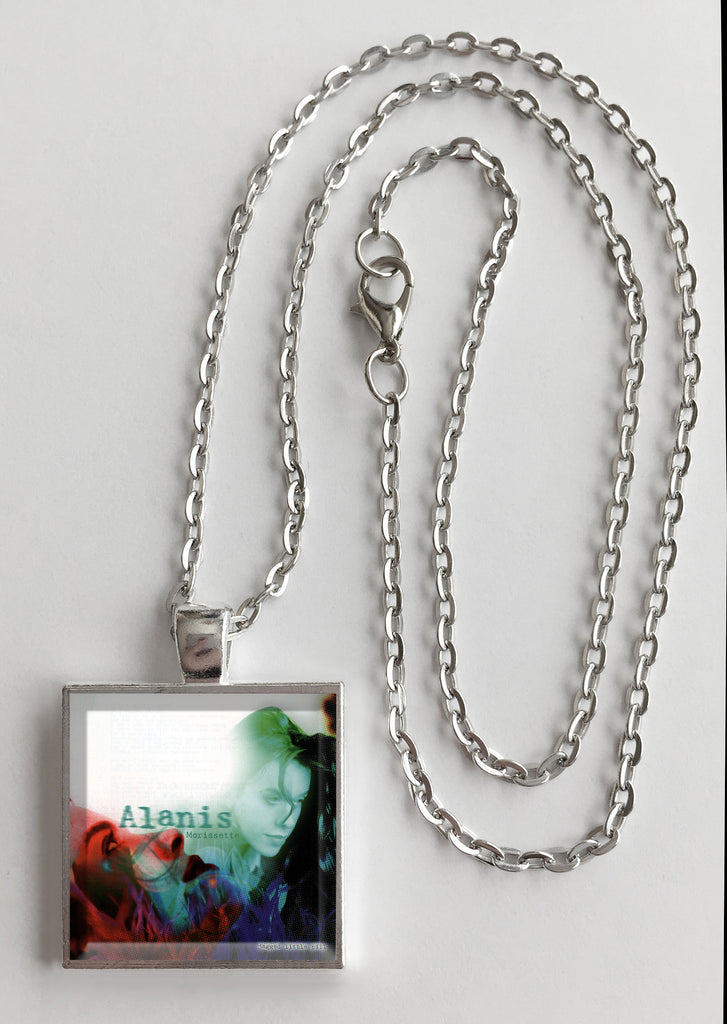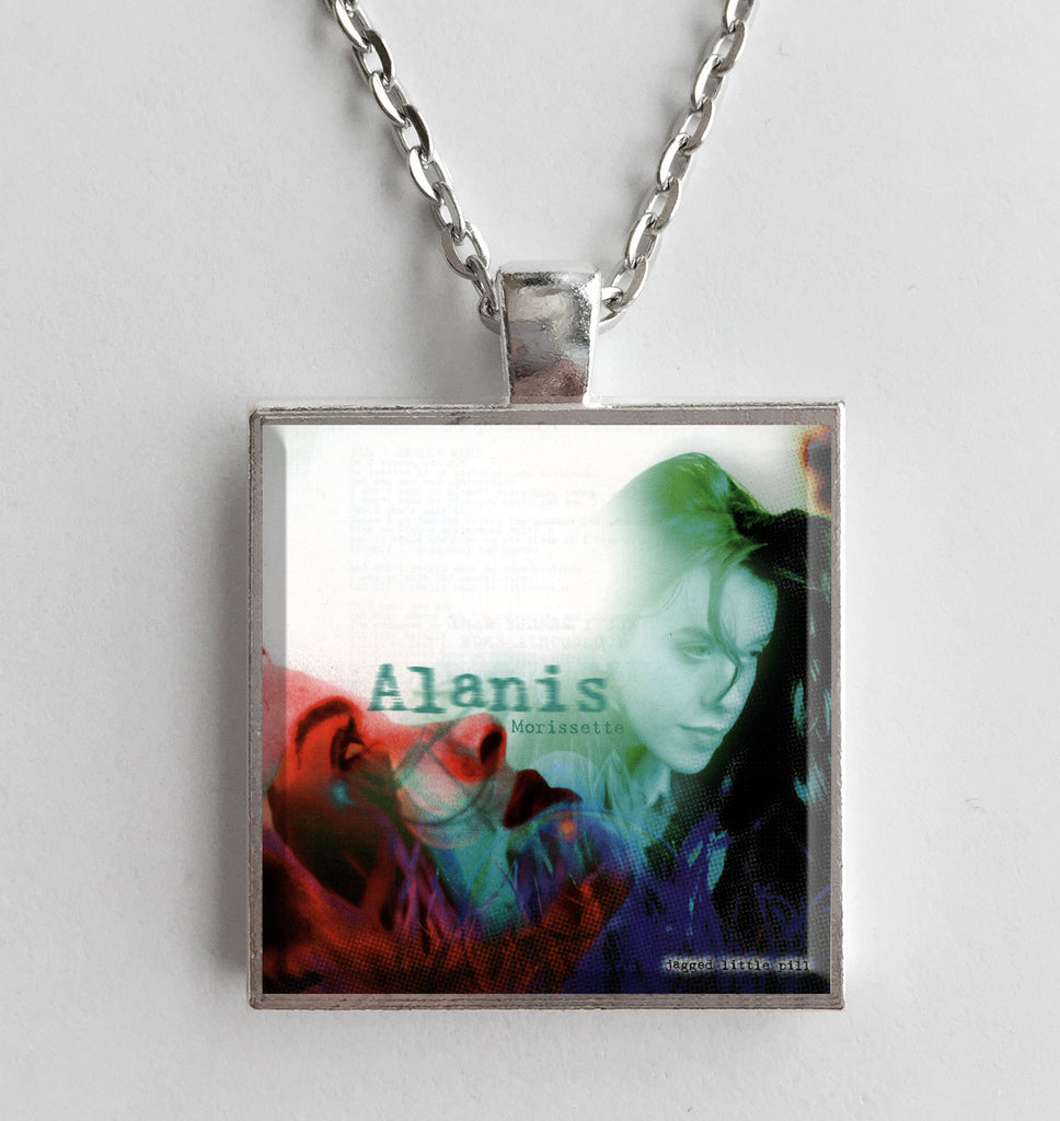 This is a necklace featuring cover art of the "Jagged Little Pill" record by Alanis Morrisette in a silvertone metal setting with glass. The album cover pendant is 1" and on a 20" long silvertone neck chain. The necklace is individually handcrafted in the USA. Please avoid exposure to water, such as swimming or showering while wearing. Show off your favorite artist!