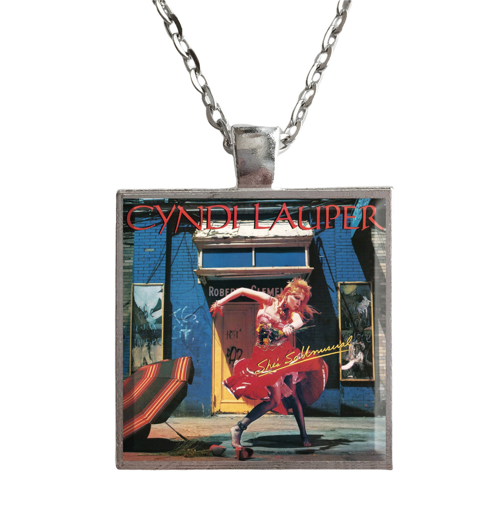 This is a necklace featuring album art of the "She's So Unusual" record by Cyndi Lauper in a silvertone metal setting with glass. The album cover pendant is 1" and on a 20" long silvertone neck chain. The necklace is individually handcrafted in the USA. Please avoid exposure to water, such as swimming or showering while wearing. Show off your favorite artist!