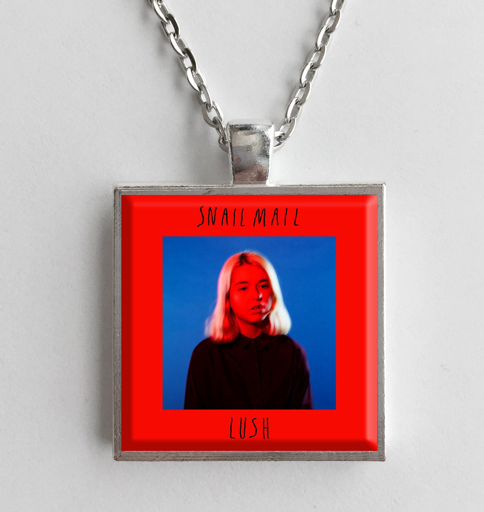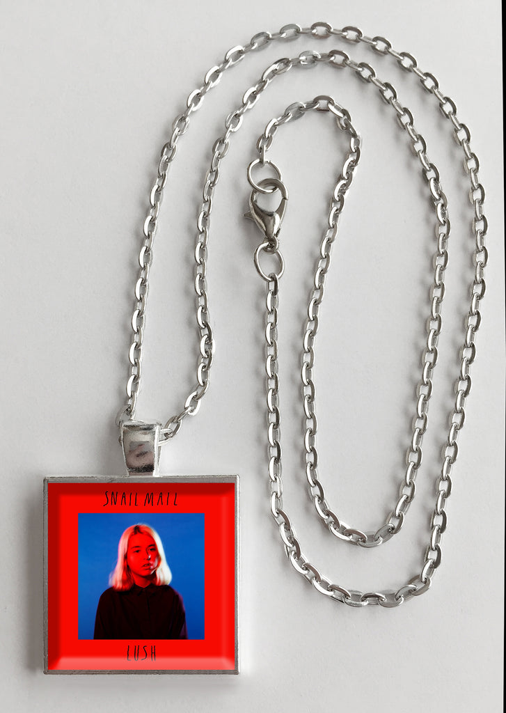 This is a necklace featuring cover art of the "Lush" record by Snail Mail in a silvertone metal setting with glass. The album cover pendant is 1" and on a 20" long silvertone neck chain. The necklace is individually handcrafted in the USA. Please avoid exposure to water, such as swimming or showering while wearing. Show off your favorite artist!