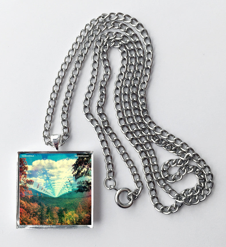 This is a necklace featuring album art of the "Innerspeaker" record by Tame Impala in a silvertone metal setting with glass. The album cover pendant is 1" and on a 20" long silvertone neck chain. The necklace is individually handcrafted by me in the USA. Please avoid exposure to water, such as swimming or showering while wearing. Show off your favorite artist!
