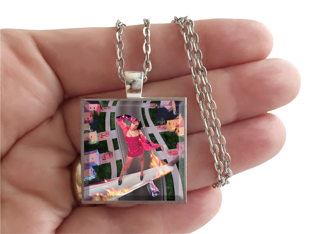 This is a necklace featuring album art of the "I Used to Think I Could Fly" record by Tate McRae in a silvertone metal setting with glass. The album cover pendant is 1" and on a 20" long silvertone neck chain. The necklace is individually handcrafted in the USA. Please avoid exposure to water, such as swimming or showering while wearing. Show off your favorite artist!