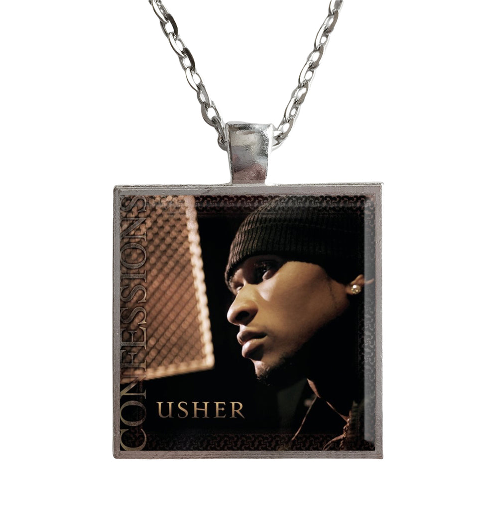 This is a necklace featuring cover art of the "Confessions" record by Usher in a silvertone metal setting with glass. The album cover pendant is 1" and on a 20" long silvertone neck chain. The necklace is individually handcrafted in the USA. Please avoid exposure to water, such as swimming or showering while wearing. Show off your favorite artist!