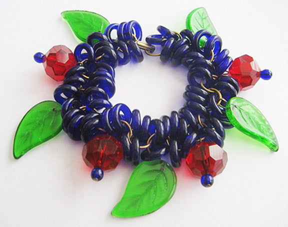 Ruby Red Beads & Cobalt Blue Glass Rings with Big Leaves Bracelet