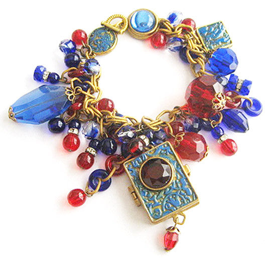 Cobalt and Ruby Glass Charm Bracelet with Ornate Locket & Key