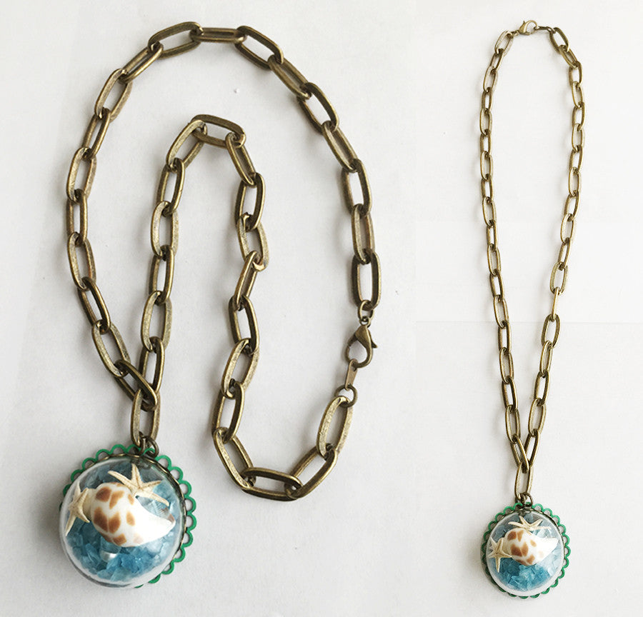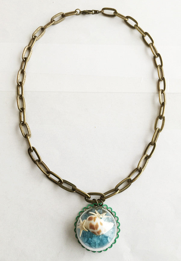 This is a handcrafted necklace with a glass dome pendant filled with blue sea glass chips, genuine starfish and a seashell. The1 1/4” pendant is made of glass and antiqued goldtone metal and is on a heavy 18” antigued goldtone metal link chain. Very special and Mermaid’s keepsake!