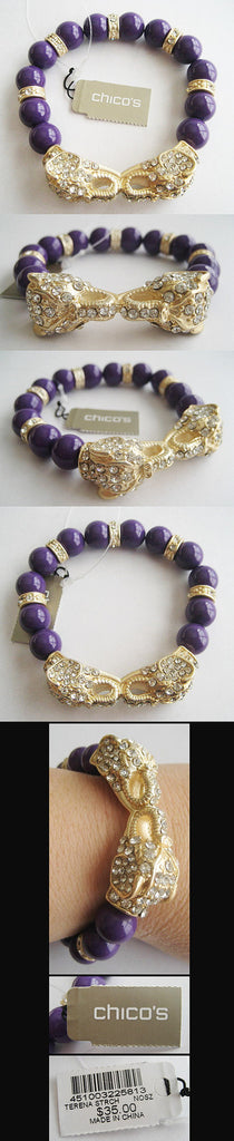 This is a brand new "Terena" stretch bracelet with chunky purple beads, rhinestone rondelles and goldtone metal trunk up Elephant heads encrusted with clear crystal rhinestones. The bracelet measures 3/4" at it's widest in the front, will stretch to accomodate most wrist sizes and has it's original paper $35.00 Chico's tag still attached. Lots of Boho style!