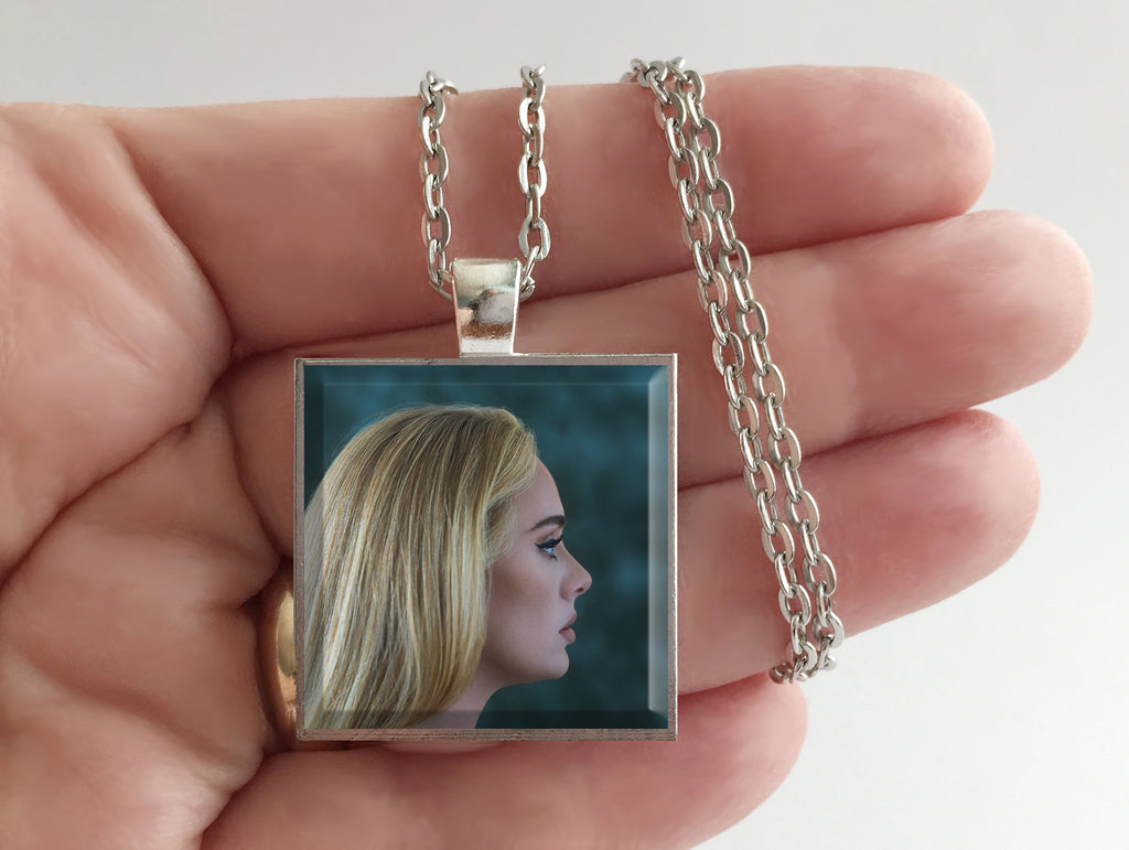 This is a necklace featuring album art of the "30" record by Adele sealed in a silvertone metal setting. The album cover pendant is 1" and on a 20" long silvertone neck chain. The necklace is individually handcrafted by me in the USA. Please avoid exposure to water, such as swimming or showering while wearing. Show off your favorite artist!