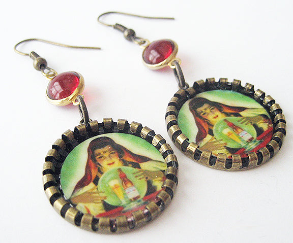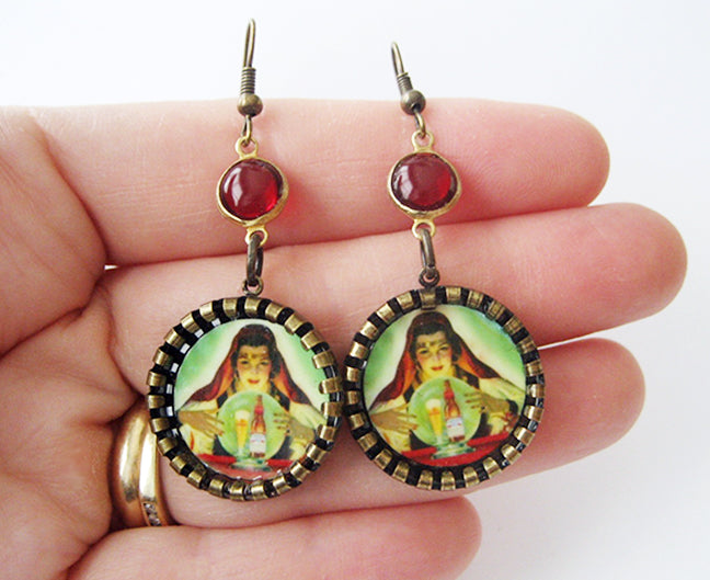 This is a handmade pair of earrings with a vintage image of a Gypsy fortune teller peering into her crystal ball in the center of antiqued goldtone metal settings. The earrings measure 1 1/2” with unfoiled bezel set red glass at the top, have fish hooks for pierced ears and are in new, unworn condition. Whimsical and fun!